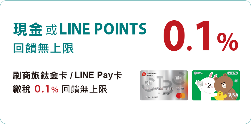 | 2. | 繳稅刷商旅鈦金卡享現金回饋、刷LINE Pay卡享LINE POINTS回饋、刷uniopen卡享OPENPOINT回饋、刷和泰卡享和泰Points回饋,財管鼎鑽卡享現金回饋、刷中華航空聯名卡享華航哩程回饋、刷ANA聯名卡享ANA哩程回饋;除活動提及外,刷其他中信卡繳稅均無繳稅回饋;另可申請分期優惠方案,有設定繳綜所稅分期優惠活動之客戶不適用上述繳稅回饋,分期/回饋優惠二擇一適用(偏好繳稅回饋客戶,請勿設定繳稅分期優惠活動)。 |